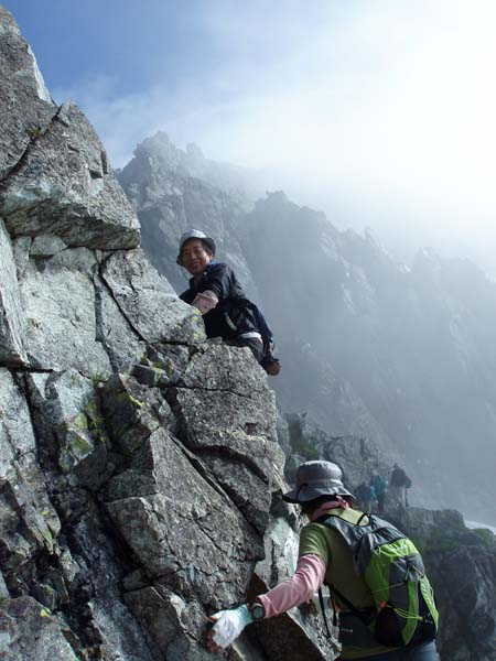 る必要がある。この一瞬だけは鎖が命綱である。ここからは上り下りの道が別々、浮石