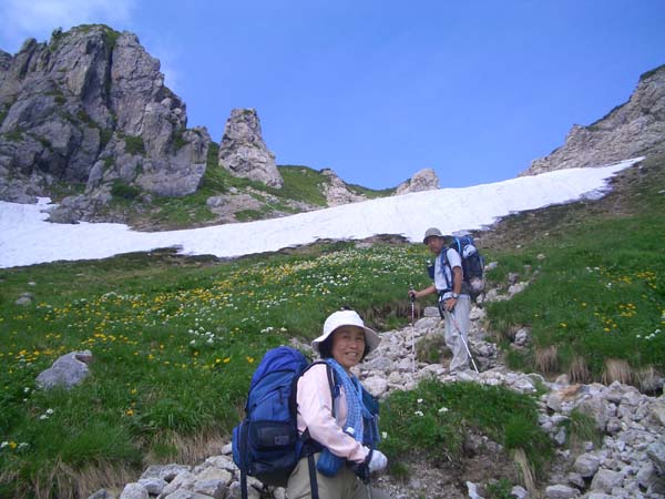 ザレ場、雪渓、岩場等ゆっくり気をつけて、と自分に言い聞かせ慎重に足を運ぶ。山頂付