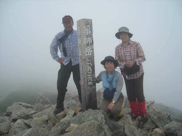 と、薬師岳がドーンと見えるはずなのだが‥‥。大きな岩を乗り越え、北薬師、本峰に着く。