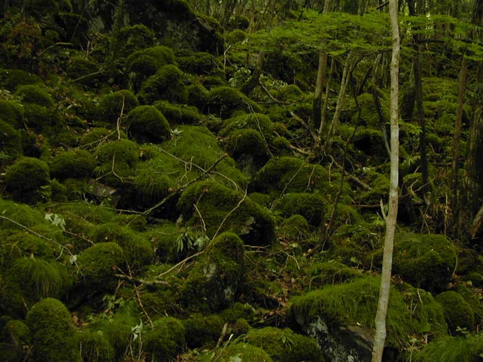 い不思議な風景でした。昼食を済ませて、さあ、苔の名所へ。奥の方へ入って行くとち