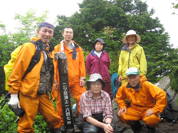 景が眼下に広がっているはずだがまったく視界はない。蛾蔵越で女性陣と合流し雨の中を