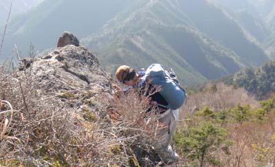 ようやくに、スズタケの急登を上がると、大岩にぶつかる。これを左に巻いて、岩場の上に