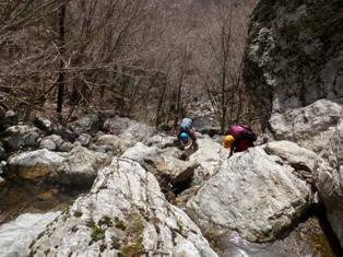 つめ岩陵を這い上がり、滑り下りながら沢を左右に渡渉し途中昼食をとり、谷か