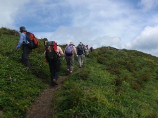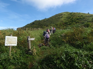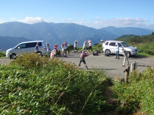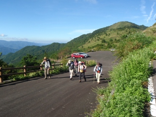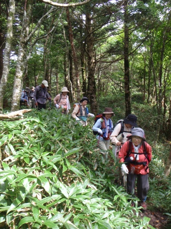 | 9月例会山行 Aランク 矢筈山 【日 時】 2010年9月12日(日) 【天候】晴れ 【コースタイム】 石井町役場5:50――貞光ゆうゆう館6:35/7:00――落合峠登山口7:45/ 8:25‥‥サガリハゲ分岐10:07‥‥大岩10:55‥‥矢筈山山頂11:00/11:35 ‥‥分岐12:10‥‥落合峠登山口13:40/14:00――貞光ゆうゆう館15:14/ 15:25――石井町役場16:20 【感 想】 ススキの穂が祖谷より吹き上がる風に一斉になびく落合峠。平家落人伝説を残す この峠には似合いの風景だ。 ストレッチの後、地図とコンパスで目標物 ・矢筈 山を設定する。矢筈山はわずかに頭をのぞかせ、奥深くひっそりとかし こまって いる。県内5位の高峰であるとは 思われない。 峠よりいきなり、東側の急な上りだ。呼吸が少々乱れるが、すぐに見通しのよい 平原状の笹原に出た。リンドウ、アキノキリンソウ、シコクフウロなどの 花が咲 いている。オオカメノキのたわわに実った赤い実が、花のように見え、心がなごむ。 やがて樅の樹林帯に入り、起伏の少ない尾根道を進む。徐々に高度を上げていくと 今日一番の急登だ。這うようにして上りきると、サガリハゲ山への分岐に出る。 北斜面をトラバースして進み、視界のひらけたコルに出て3回目の休憩をとる。 ここからは剣山、次郎笈、黒笠山の峰筋がくっきりと見えた。 原生林の急な尾根を上ると、巨岩があり、間もなく展望抜群の頂上だ。風が冷た く、心を洗われる気がする。来し方のサガリハゲ山がすぐそれとわかり、右奥には 烏帽子山のピークも指摘できる。昼食後、同一ルートで下山。 途中、岡山や香川からの団体さんに会い、この山の人気の高さのほどを思った。 午後1時40分、落合峠登山口に到着。汗ばんだ身体に、秋風が心地よい。車中い っぱいこの空気を詰めこんで帰路についた。皆様、お疲れさまでした。 |