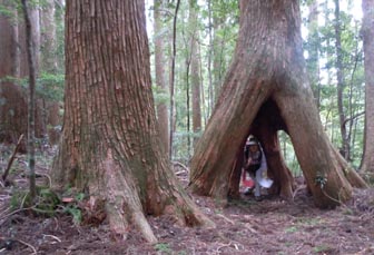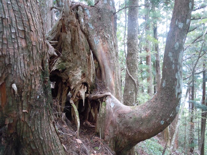 翌朝、登山口から吊り橋を渡り、よく整備された木道を登ると、やがて傘杉堂に到着する。