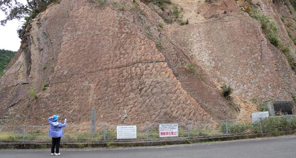 の大きな壁面が道ぞいにあります三千年―四千年前に海底にできた波の模様が土砂の堆積