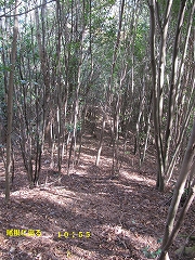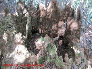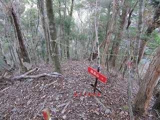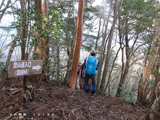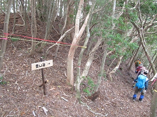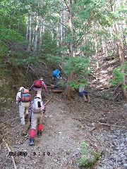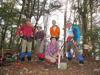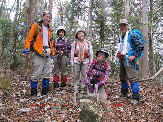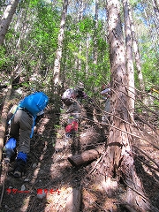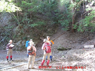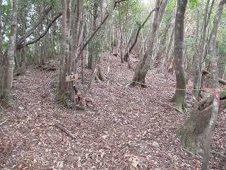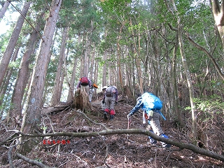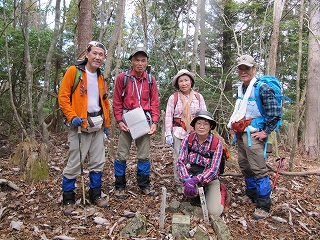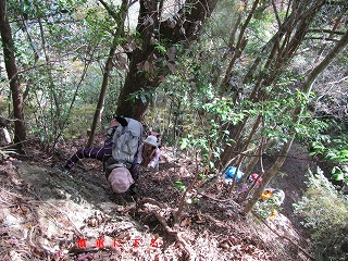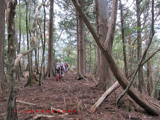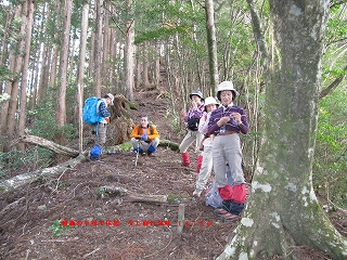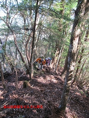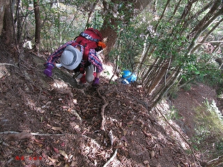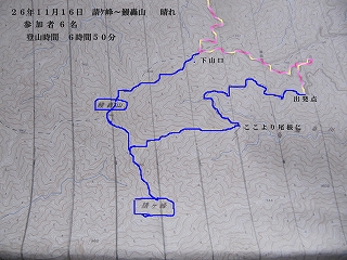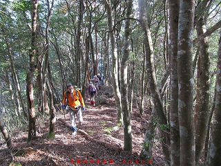 11月例会山行 Bランク 請ヶ峰〜鰻轟山【日 時】2014年11月16日(日) 【天 気】 晴れのち曇り 8〜12C 【参加者】6名 【コースタイム】 文化の森河川敷駐車場6:00---長安ロダム7:30(トイレ休憩)---記念碑下山口8:15 /8:20(車デポ)……請ヶ峰林道入りロ8:30/8:50……尾根取り付き点9:40尾根9:50 ……主稜線(H960m)11:20……請ヶ峰(1009.1m)12:20/12:50……鰻轟山14:30/14:45 ……記念碑下山口15:40/16:1(トー長安ロダム・一一文化の森河川敷駐車場18:40 【記 録】 6:00 文化の森河川敷駐車場を車2台で出発し、R55、R195、R193を経て下山口となる道路開通 記念碑下山口(那賀町と海陽町の境にある)へ1台の車をデポして請ヶ峰林道入り口へ、下山口 から請ヶ峰林道入りロまでは霧越峠を通り10分で着く。林道入り口にはゲートがあり車は入れ ない。 R193の道端に車を置き準備を整え請ヶ峰林道をスタートする。 9:36 ゲートから3kmほど林道歩いた地点で目指す尾根にたどり着く。無用の長物となって いるカーブミラーがある林道の下と、見上げる尾根にも踏み跡があるが取りつくことはできず、先に 5分程回り込んだ地点から尾根に取り付く。倒木等で足場が悪いが5分程で踏み跡のある尾根に 出る。 9:50 ここから尾根をひたすら上に向かって進むが標高差約500m、等高線に垂直の登りの ため結構厳しい。途中H620mあたりで休憩し、H960mの主稜線には11:20分に着く。 11:20 那賀町と海陽町の境となる主稜線に着く。ここから北北西(右)に行くと鰻轟山、南 (左)が請ヶ峰である。請ヶ峰まではlkmほどの行程であるがアップダウンがあって緊張する下りも あり時間がかかる。岩場の下りではつかまる岩がもろく崩れるので要注意! 12:20 請ヶ峰に到着。記念撮影をして昼食後、往路をしばらく引き返し鰻轟山に向かう。 14:30 途中で朝、請ヶ峰林道からの上り詰めた地点を通り過ごして、何度か休憩を取り ながら鰻轟山にたどりつく。 14:45 下山口に向かって下り始める。鰻轟山では遭難が多発したためか新しい標識が目立つ。 山頂と登山口との中間地点にある独標902m地点では道迷いが多い為なのか稜線のトトはローズで 通行止めにしてあり巻道を通るようになっているが、斜面にある道は、狭く崩れそうで転落しそ うな箇所が多く登山道には不向きなように思われた。 15:40 H800mあたりで元の登山道に戻り足元もしっかりした登山道を下り、大きな記念碑のあ る下山口に到着する。請ヶ峰林道入りロヘ車の回収にでかけている間にク吋ダウンをする。 歩数計は17000歩弱だったが、一日いっぱい歩いたと実感した山行であった。 16:10 往路をひきかえし文化の森河川敷駐車場には18:40分に帰着。 |