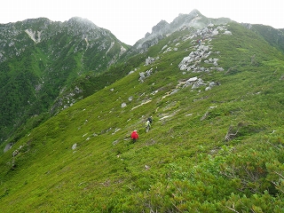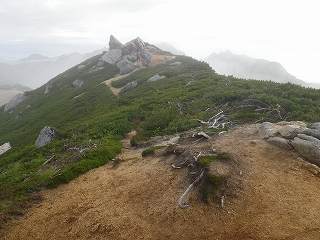 いた。ガスに雨粒が混じりだした南駒ケ岳の手前の岩陰でカッパを着用。空木岳から
