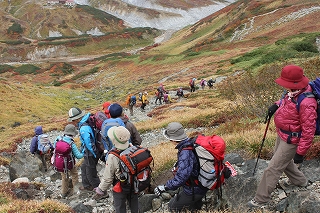 9月例会山行 Aランク 立 山 周 辺(紅葉)【月日】9月27日(土) 【コースタイム】 松茂空港200円駐車場5:00/5: 00=日の出5:53淡路SA(休憩)5:58/6:10=吉川JC6 : 42六入部PA(休憩)7 : 23/7 : 36=杉津PA9:07/9:21ニ小矢部川SA(昼食)10 : 51/n:37= 立山IC12:07=雄山神社及び立山博物館12:30/13:40=立山駅13:50/14:20=美女平14:30/14: 40=天狗平山荘15 : 25 交流会18:5o/20:00 消灯21:00 【月日】 9月28日(日) 天候 曇りのち晴れ 【コースタイム】 起床5:30朝食6:30ストレッチ出発7:17…休憩8 : 00/8 : 05…弥陀ヶ原まで2.6kmの標 識8:17…休憩8 : 44/8:55…弥陀ヶ原10 : Q6…弥陀ヶ原バス停1.0km標識10 : 15…弥陀ヶ 原周回分岐(休憩)10 : 26/10:38…水道広場10 : 42/10 : 48…弥陀ヶ原バス停11:00/11:30 =室堂ターミナル(昼食)11:53/12:40…休憩13: 15/13:23…立山カルデラ展望台13:53/14: 10…浄土山(軍人碑)山頂15 : 35/15 : 45…富山大学立山研究所16 : 10/16 : 18…一の越山荘 16 : 58 夕食18 : 00交流18 : 30〜19 : 30 消灯21 : 00 【月日】 9月29日(月) 天候 快晴 【コースタイム】 起床5:30朝食6:00/6:30ストレッチ出発6:45…雄山山頂8:52/9:34…大汝山10 : 20/10 : 40…冨士ノ折立取付き(昼食)11 : 02/11 : 44…真砂岳コル(休憩)12 : 35/12 : 43…犬走 り分岐12 : 47…休憩12 ; 55/13 : 05…真砂岳取付き分岐13 : 08…別山取付き13 : 43/13 : 50…分岐14 : 06/14 : 15…剣沢分岐14 : 30/14 : 40…剣御前小舎15 : 10/15 : 20…剣沢分岐’ 合流15 : 26…剣御前小舎15 : 39 夕食17 : 00/17 : 30 夕陽鑑賞後交流会18 : 15/19 : 30消灯 21 : 00 【感想】 早朝より平地では見られないほどの、星空の世界を眺めながら起床。 朝食をすませ、ストレッチ後いよいよ雄山への挑戦が始まる。 ゆっくり、ゆっくりと岩場の登山道を登づて行く。薬師岳、噴煙が続いている御嶽山 白山等の山々が、パノラマ写真を見ているような展望が広がってくる。 昨日の不安は打ち消され、比較的楽に頂上へ到達する。 3003mの頂上にある雄山神社 で 祈祷をうけ、立山三山の尾根を進む。やっとの思いで富士ノ折立に着く。 日の前にみんなが噂していた、剱岳の断崖が垂直にそびえ立つ姿は迫力を感じた。 あの山に登れるのかと思うと、鳥肌がたつ。でも一度は登って見たいという気持ちにか られる。せめて登頂した気分になり剱岳をバックに写真を一枚!! ここから一時間ぐらいで剱御前小舎に着くと激励され、尾根を重い足取りでひたすら歩く。 剱御前小舎から見る夕陽も素晴らしく疲れを癒してくれた。夕食後小舎で最後の交流会。 全員が秋の立山山行に大満足と話していた。 また山歩きの方法、注意点、悪天候時の体験などと話に花がさく。明日も天気になりま すようにと祈りながら就寝。 9月30日(火) 天候 晴れ時々曇り 【コースタイム】 起床4:30朝食5 : 00/5 : 20 日の出撮影ストレッチ5:50出発6:02…新室堂乗越7 : 26/7 : 36…雷鳥沢8 : 18/8 : 35…ミクリガ池ピーク(鎌田先生お接待)9 : 22/9 : 35…室堂ターミナル9: 52/10 : 15=大観望10 : 25/10 : 50⇒黒部平10 : 57/11 : 10=黒部湖11 : 15…ダム散策…黒 部ダム11 : 45/12 : 05=扇沢12 : 21/12 : 33=大町温泉(入浴・昼食)12 : 50/14 : 16=土産 物センター14 : 53/15 : 15=恵那峡SA17 : 00/17 : 15=養老SA(夕食)18 : 20/18 : 56=西官 名塩SA20 : 40/20 : 55=淡路南PA22 : 00/22 : 10=松茂駐車場22 : 31 (解散) 【感想】 今朝は曇り、でも周囲の展望には支障なし。木枯らしのような強い風と冷えでほとんど の人がダウンを着用している。朝日が望めない為、あきらめて室堂へと下山開始。 岩場の登山道を緊張感を保ちながら下って行く。色合いもコントラストも抜群の紅葉を 望みながら、また前日縦走してきた立山三山、立山連邦を展望しながらの下山は疲れを 感じさせなかった。すれ違うパーティから「剱に行ってきたん」と尋ねられる。「イイ エ、あの山を登ってきたんです」と指さしながら誇らしげに言葉を返す。 雷鳥沢で小休止して、最後の登り石段へ。登りつめた時大先輩の鎌田先生一行のお接待 を受ける。仲間たちは疲れも忘れ、偶然の再会に感激の声を上げている。温かいコーヒ ーの接待にも満足そう。 青くすんだ池の中に山々の雄姿と、素晴らしい紅葉が映し出されている。みくりが池通 過、予定どうりに室堂バスターミナルに到着する。 これからの山行は観光となり、高原バスに乗り大観峰へ。ケーブルカーからの紅葉は弥 蛇ヶ原湿原の時よりも鮮やかで乗客の感嘆する声があっち、こっちから聞こえてくるほ ど素晴らしかった。 日本最大のアーチ型ダム、黒部ダムから放水される水が陽ざしを浴びる度に虹を作り美 しさを増していた。 温泉で疲れを癒しバスにゆられて帰路に着く。 事故もなく楽しい山行になるよう配慮して下さったCLさんをはじめ、メンバーの皆様 お世話なりました。初めての秋の山行、感動いっぱいで私の思い出としていつまでも残 る事でしょう。 |