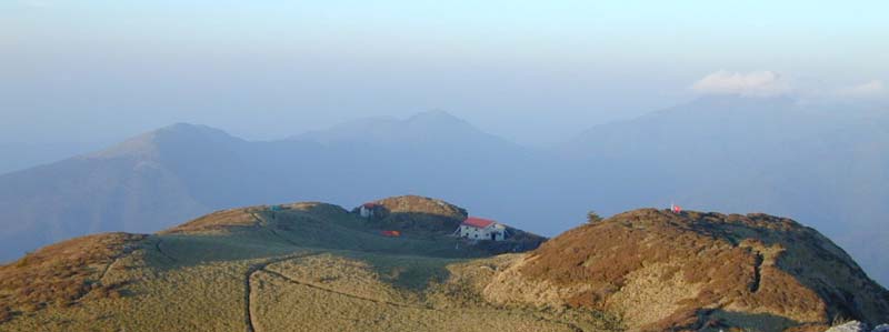 三嶺 西方から見た夕景。右のピークが頂上 1893.4m。(カーソルOUT) 三嶺から見た西熊山、右のピーク(カーソルOVER)